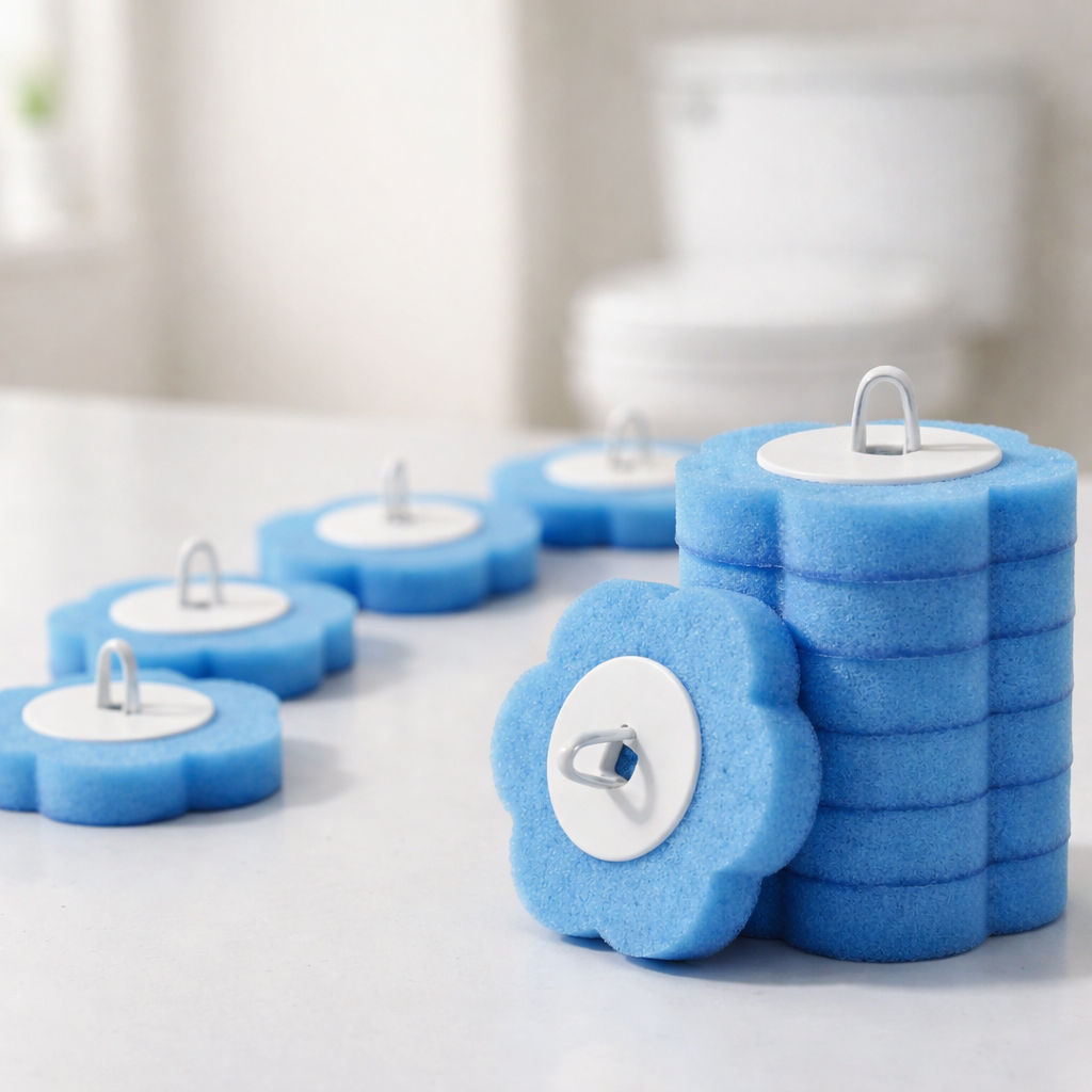 Une formule nettoyante intégrée dans chaque tête. Au contact de l'eau, elle s'active instantanément — sans manipulation, sans produit supplémentaire.